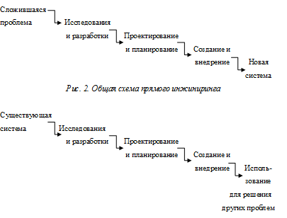 В современном инжиниринге различают несколько базовых методических подходов. Так, традиционный инжиниринг базируется на прямой цепочке шагов от анализа проблемы до проектирования и создания системы, решающей эту проблему. Такой инжиниринг называют прямым инжинирингом. Кроме прямого инжиниринга, достаточно часто возникает необходимость использования обратного инжиниринга, при котором изучается действенность уже существующего решения, после чего результаты анализа могут быть использованы для улучшения системы или для разработки новых решений. Обратный инжиниринг активно используется, в частности, в инжиниринге материалов. При этом отправной точкой является анализ использования уже существующих материалов в традиционных областях, а затем, отталкиваясь от результатов анализа, делаются выводы о возможности использования этих материалов в других областях или же о целесообразности использования в данных решениях других материалов. Общие сравнительные схемы прямого и обратного инжиниринга показаны на рис. 2 и 3.