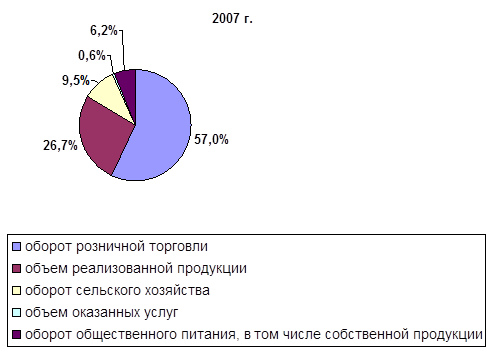 Диаграмма показывает, что в 2007 году наибольший удельный вес в общем обороте составляет оборот розничной торговли (57,0 %), затем следует объём выпускаемой и реализованной продукции (26,7%), далее - оборот сельского хозяйства (9,5 %), оборот общественного питания – (6,2 %) и объём оказанных услуг (0,6 %).