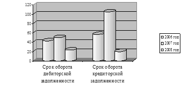В целом можно отметить рост оборачиваемости дебиторской и кредиторской задолженности в 2008 году по сравнению с 2007 годом. Достаточно высокое значение данного коэффициента подтверждает благоприятную характеристику финансового состояния, сделанную на основе показателей, рассчитанных в предыдущем разделе. На рисунке 2.7 представлена динамика оборачиваемости кредиторской и дебиторской задолженности.