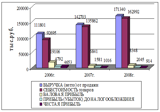 Показатель "Выручка от продажи товаров" увеличивается в 2008 году в 1,533 раза к 2006 году. Это происходит за счет увеличения объема выпускаемой продукции, который обеспечен привлечением капитала (рост валюты баланса). Анализируя «себестоимость проданных товаров», мы наблюдаем рост себестоимости в 2008 году в 1,758 раза. Рост себестоимости - явление отрицательное, более того себестоимость растет быстрее, чем выручка. Но этот рост оправдан ростом объемов продаж.