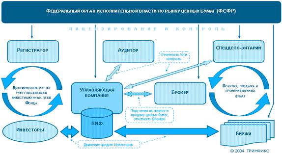 В инфраструктуре ПИФа, каждая организация выполняет четко регламентированные функции, которые призваны защищать интересы пайщиков. Кроме того, комплект отчетности ПИФа (бухгалтерский баланс, отчет о приросте/уменьшении стоимости имущества, справка о несоблюдении требований к порядку и структуре ПИФов, справка о стоимости активов, справка о стоимости чистых активов и т.д.) ежемесячно предоставляется управляющей компанией в Федеральную службу по финансовым рынкам.