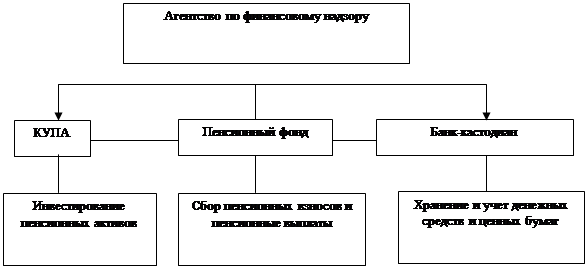 Как видно из рисунка 1, функции строго разделены: фонды осуществляют сбор обязательных и добровольных пенсионных взносов вкладчиков и пенсионные выплаты получателям; компании по управлению активами занимаются непосредственно инвестированием путем размещения средств в депозиты, государственные и корпоративные ценные бумаги и в другие финансовые инструменты; банк-кастодиан оказывает услуги по ответственному хранению, учету вверенных ценных бумаг денежных средств клиентов. Эти структуры взаимно контролируют друг друга и несут имущественную ответственность за свои действия, т.е. создана система многоуровневого контроля. Государственный контроль осуществляет Агентство по финансовому надзору. Кроме того, между банком-кастодианом и компаний по управлению накопительными пенсионными активами (КУПА) не должно быть аффилированности, поскольку банк обязан регулировать соответствие финансовых инструментов, в которые инвестируются активы, с теми нормами, которые устанавливает Национальный Банк Республики Казахстан.