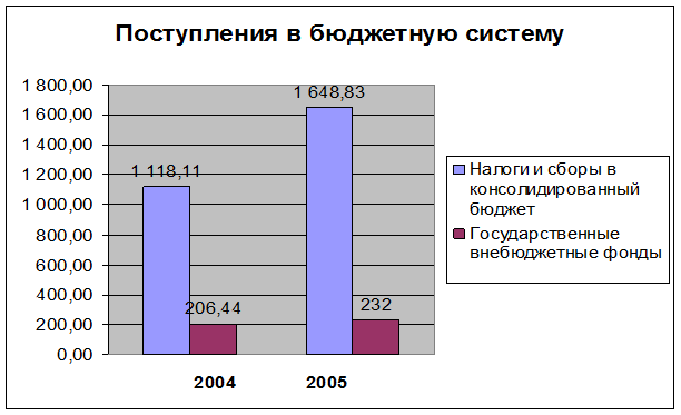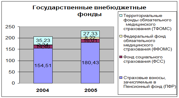 Из графика 2 видно, что помимо того, что увеличился объем самого фонда с 206,44 млрд.руб. (за 2004) до 232,00 млрд.руб. (за 2005), увеличился так же объем отчислений во все фонды (территориальные фонды обязательного страхования, федеральные фонды обязательного медицинского страхования, фонды социального страхования, страховые взносы в Пенсионный фонд России на 25,92 млрд.руб. с 154,51 млрд.руб. (2004) до 180,43 млрд.руб. (2005)).