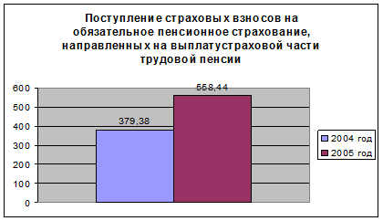 Поступление страховых взносов на обязательное пенсионное страхование, направляемых на выплату страховой части трудовой пенсии, предусмотрено в сумме 558,44 млрд. рублей, что соответствует 147,2% к поступлениям страховых взносов, установленным бюджетом Фонда на 2004 год.(см. график3).