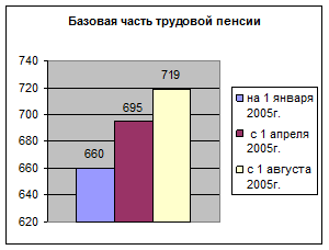 В 2005 году предусмотрено увеличение базовой части трудовой пенсии по старости с 1 апреля 2005г. с 660 рублей до 695 рублей в месяц, что соответствует индексации на расчетный индекс роста инфляции - 5,3%, и с 1 августа 2005г. - до 719 рублей (на 3,5%).