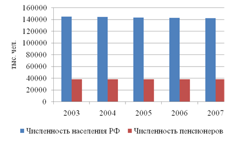 Как очевидно из графических данных, представленных на (рис. 5), соотношение численности населения и пенсионеров в России примерно одинаковое на протяжении последних лет. Тем не менее, с 2003 по 2007 гг. процент пенсионеров от общей численности населения возрос с 26,327% до 27,047% (то есть на 0,747%).