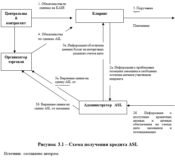 Администратор ASL по прописанным в регламенте ASL процедурам определяет для каждой из проблемных клиринговых позиций состав кредиторов ASL и формирует портфель обеспечения сделок ASL из ценных бумаг заемщиков ASL. Затем администратор ASL формирует заявки на заключение сделок ASL, рассчитывая значения денежных параметров сделок РЕПО. Макеты заявок на сделки ASL передаются администратором ASL в торговые терминалы KASE кредиторов и заемщиков (брокеров кредиторов и заемщиков) для регистрации на специализированной торговой сессии ASL (рис. 1 (За, 36)). Одновременно администратор ASL передает в клиринговую организацию информацию об остатках ценных бумаг на неторговых разделах счетов депо участников ASL со статусом «доступно для ASL» (рис. 1 (Зв)).
