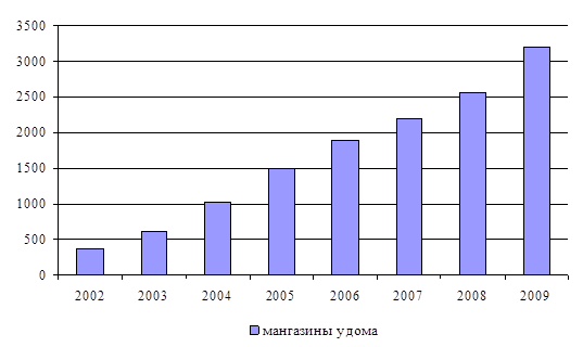 Количество магазинов Компании увеличилось с 2568 «магазинов у дома» и 14 гипермаркетов в 2008 году до 3204 и 24 соответственно в 2009 году, совокупная торговая площадь магазинов увеличилась с 823.51 тыс. кв.м. до 1 059,87 тыс. кв.м.