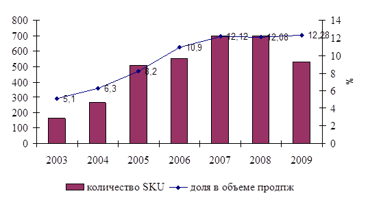 Рисунок 2 - Количество SKU и доля в объеме продаж за 2003-2009 г.
