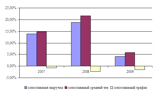 В 2009 Компания продолжила активно работать с покупателями и развивать маркетинговую программу. Тем не менее, сокращение доходов населения отразилось на показателях сопоставимой выручки, среднего чека и трафика. Рост сопоставимых продаж 2009 года к 2008 году в рублевом выражении составил 4,1% и был обусловлен ростом сопоставимого среднего чека на 5,8%, в то время как трафик имел отрицательное значение в -1,5%.