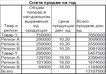 Бюджет продаж – это первый и самый важный шаг в составлении основного бюджета; оценка объема продаж влияет на все последующие бюджеты и должен отражать месячный или квартальный объем продаж в натуральных и стоимостных показателях.