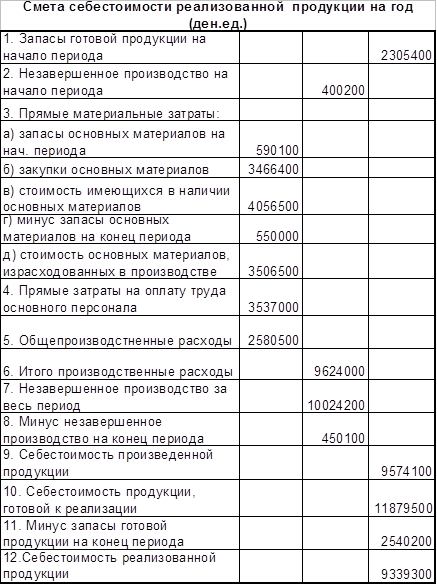 Эта смета составляется на основе ожидаемых величин товарных запасов, а также сводных данных по натуральным и стоимостным оценкам, взятым из смет 1) прямых материальных затрат, 2) затрат по оплате труда и 3) накладных расходов. Смета себестоимости реализованной продукции выглядит следующим образом: