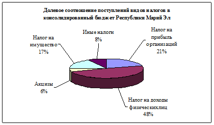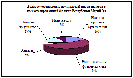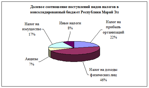 Далее рассмотрим долевое соотношения поступлений налогов в консолидированный бюджет РМЭ в 2009 году (рис.5).