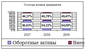 Исходя из анализа структуры активов предприятия, можно сделать следующие выводы: наибольшую долю в структуре активов предприятия в течение всего анализируемого периода занимают оборотные активы. Анализируя цифровые показатели, налицо тот факт, что их величина за период с 2007 по 2009 год варьируется в пределах от 55,6 процентов в 2007 году до 54,6 процентов в 2009 году.