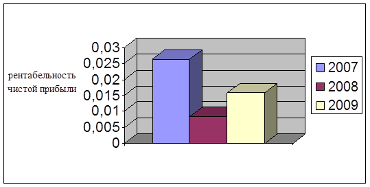 Таким образом, финансовая рентабельность чистой прибыли в 2008 году снизилась по сравнению с 2007 годом на 0,018 и составила 0,0083 (в 2007 году предприятие получало 2,63 копейки чистой прибыли на рубль вложенного капитала, а в 2008 году – 0,83 копейки). В 2009 году данный показатель увеличился по сравнению с 2007 годом на 0,0076 и уменьшился по сравнению с 2007 годом на 0,0104 и составил 0,0159 (в 2009 году предприятие получало 1,59 копейки чистой прибыли на рубль вложенного капитала). Таким образом, динамика финансовой рентабельности чистой прибыли за анализируемый период не имела стабильной величины, однако имела место быть тенденция к ее уменьшению. Динамика изменения рентабельности чистой прибыли представлена на рисунке 7.