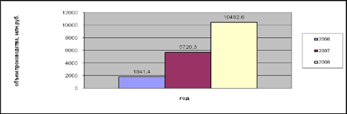 По итогам работы за 2008 г. объем производства продукции возрос в 1,8 раз по сравнению с 2007 г. (с 5 720,3 млн. р. до 10 482,0 млн. р). данный рост обусловлен совершенствованием материально-технического обеспечения, использованием новых технологий в производстве, что позволило привлечь новых клиентов.