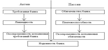 Ликвидность банка определяется сбалансированностью его активов и пассивов и в определенной степени соответствием сроков размещения активов и привлеченных пассивов. Связь ликвидности, платежеспособности и надежности представлена на схеме 2.