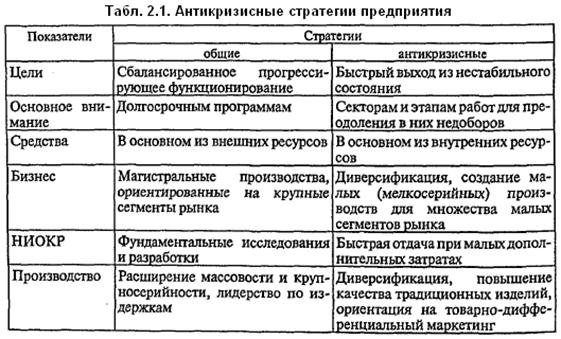 Антикризисные стратегии промышленной фирмы существенным образом отличаются от обычных. Это объясняется их весьма высоким динамизмом, ресурсной жесткостью и повышенной результативностью как в позитивном, так и негативном плане. Некоторые сравнительные характеристики общих и антикризисных стратегий приведены в табл. 2.1.
