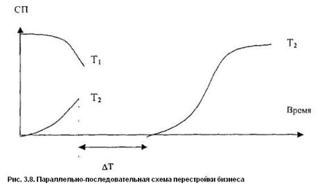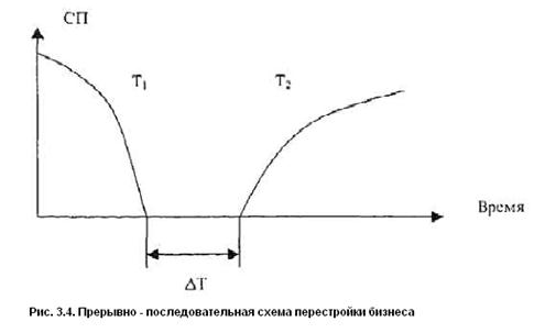Прерывно-последовательная схема. Этот вариант (рис. 3.4) применяется тогда, когда необходимо дополнительное время ∆Т1 на структурную перестройку бизнеса, технологии или товара.