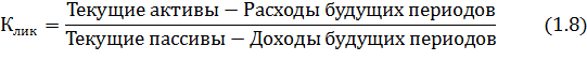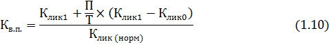 где Клик 1 и Клик 0 соответственно фактическое значение коэффициента ликвидности в конце и начале отчетного периода; Клик. (норм) - нормативное значение общего коэффициента ликвидности; П- период восстановления платежеспособности, мес.; Т- отчетный период, мес.