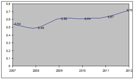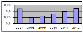 Снижение рассматриваемого показателя в 2008 году можно объяснить тем, что капитал предприятия уже был увеличен за счет кредита, но производственный цикл еще не был начат. Увеличение показателя оборачиваемости капитала на 0,03 в 2012 году объясняется, что именно в этом году был выплачен кредит, что соответственно привело к уменьшению капитала предприятия по сравнению четырьмя предыдущими годами. Значение 0,7 этого показателя значения показателя говорит о том, что за 1 год предприятие оборачивает 70% совокупных активов, что является хорошим показателем для столь капиталоемкой отрасли, как добывающая.