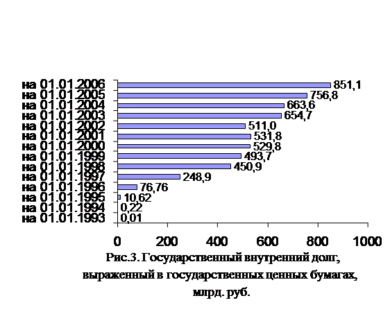 На 3 апреля 2006 года объем внутреннего долга, выраженного в государственных бумагах, составил 880 572,443 млн. руб., тогда как по состоянию на 1 января 2005 года он составлял 756820,0 млн. рублей. Таким образом, увеличение государственного внутреннего долга за этот период составило 14,5 % или 123752,443 млн . руб.