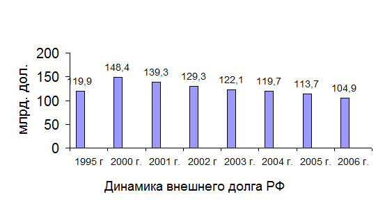 В последние годы наметилась тенденция к сокращению внешнего долга Российской Федерации. В 2000 г. он составил 148,4 млрд. долл., а по состоянию на 1 января 2006 г. снизился до 104,9 млрд. долл.