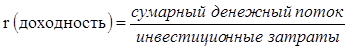 Доходность (r) определяется как отношение суммарного денежного потока от инвестиционного объекта к инвестиционным затратам.