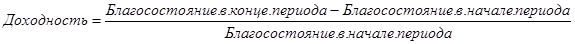где "благосостоянием в начале периода" называется цена покупки одной ценном бумаги данного вида в момент t = 0 (например, одной обыкновенной акции фирмы), а "благосостоянием в конце периода" называется рыночная стоимость данной ценной бумаги в момент t = 1 в сумме со всеми выплатами держателю данной бумаги наличными (или в денежном эквиваленте) в период с момента t = 0 до момента t = 1. Поскольку портфель представляет собой совокупность различных ценных бумаг, его доходность может быть вычислена аналогичным образом:
