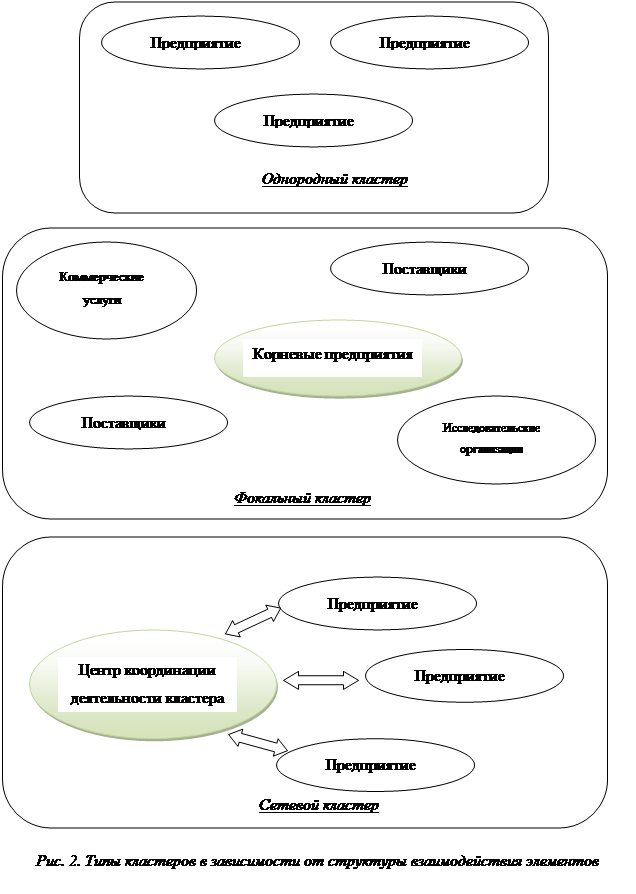 Построение кластеров по географическому принципу означает, что он четко связан с определенной территорией. При вхождении в кластер нескольких секторов машиностроения на равных правах образуются горизонтальные интеграционные процессы. Вертикальный тип кластера характеризуется иерархической связью смежных этапов инновационного и производственного процессов. Латеральный кластер отражает объединение в кластер разных секторов одной отрасли (машиностроения), которые обеспечивают экономию за счет масштаба, что приводит к новым возможностям. Объединение производств, связанных одной и той же технологией, называется технологическим (индустриальным, промышленным) кластером. Фокусный – это кластер, объединяющий предприятия вокруг одного центра, как правило, крупного предприятия. Качественный кластер предполагает постоянное совершенствование всех его элементов, взаимодействия между ними с целью повышения конкурентоспособности как отдельного элемента, так и кластера в целом.