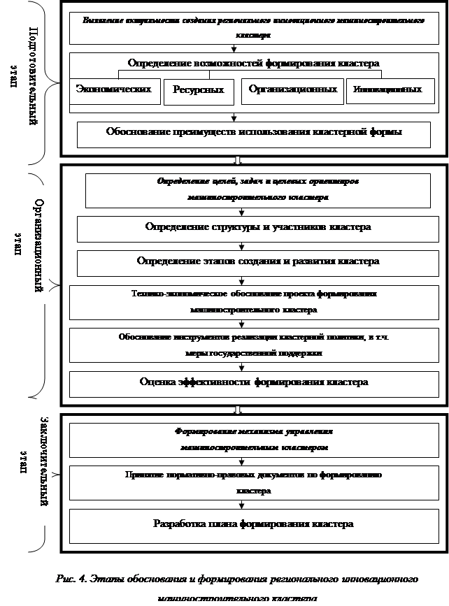 На основании изложенного можно предложить следующие этапы обоснования и формирования регионального отраслевого (машиностроительного) кластера (рис. 4). Вся процедура формирования кластера, на наш взгляд, должна проходить в три этапа: подготовительный, организационный и заключительный. На первом этапе необходимо выявить возможности формирования регионального инновационного машиностроительного кластера (РМК). С этой целью проводится оценка потенциала кластеризации, выявляются необходимые ресурсы, организационные и экономические возможности, определяются и обосновываются преимущества использования кластерной формы повышения инновационной активности. Для этого под руководством Министерства промышленности и энергетики должна быть создана рабочая группа, в которую входят представители Министерства, руководство машиностроительных предприятий и представители научной сферы.