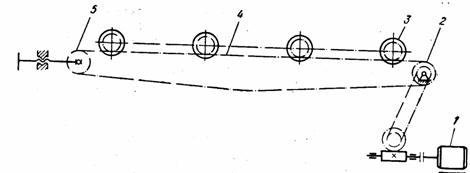Вращательное движение шпинделю 5 передается от электродвигателя / через клиноременную передачу 2, шестеренную коробку скоростей 3 и шестерню 4.