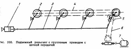 Наиболее сложно осуществлять подъем роликов рольганга, имеющих групповой привод. Кинематическая схема такого рольганга представлена на рисунке. Ролики 2 здесь установлены на двуплечных рычагах и получают вращение от электродвигателя 7 через червячный редуктор, цепную передачу 6, пару зубчатых колес 5 и двойную цепную передачу 4. В отличие от предыдущего группового цепного привода роликов каждый из роликов на конце оси имеет по две звездочки, на каждую из которых накидываются бесконечные цепи, идущие одна от предыдущего ролика, а другая к последующему ролику. Подъем роликов осуществляется от цилиндра 1, который связан с продольной тягой 3 подъема роликов. Эта тяга проходит вдоль всего рольганга и связана с двуплечими рычагами, на которых Остановлены ролики рольганга. При срабатывании цилиндра / ролики поднимаются или опускаются. Необходимо отметить, что ролики с индивидуальным приводом по сравнению с роликами с групповым приводом обладают следующими преимуществами: