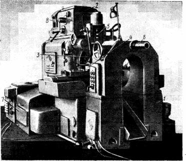 'Принцип работы станка основан на поступательном движении инструмента и вращении трубы. Станок состоит из следующих основных частей: станины 1, коробки скоростей 2, шпиндельной бабки 8, отрезных суппортов 4, фасочного суппорта 5, заднего упора 6, гидравлического привода 7, электродвигателя 8, системы охлаждения и смазки.