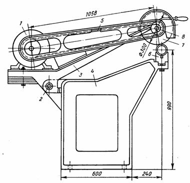 Режущим инструментом такого станка (рисунок) служит абразивный круг с приводом через клиноременную передачу 5 от электродвигателя 1. Абразивный круг 7 имеет диаметр 300 мм и вращается со скоростью 900 об/мин. Шпиндель 8, на котором закреплен абразивный диск 7, установлен на подшипниках качения. Шпиндель, электродвигатель и кожух клиноременной передачи смонтированы на металлической подвижной раме 3, которая с помощью оси 2шар-нирно соединена с литой чугунной станиной 4.