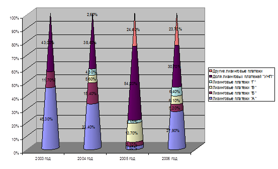 Доля лизинговых платежей по договорам лизинга с УНП в общем объеме лизинговых платежей составляет в среднем за 2004 г-2006 г.41,5% (См. Рис.17).