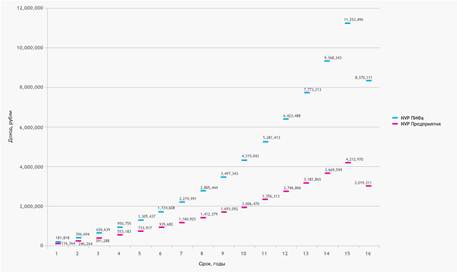Учитывая длительность периода между вложением денег и получением дохода, необходимо рассчитать чистый приведенный доход (NPV). Ставку дисконтирования примем равной средней ставке рублевого депозита — 10%. Чистый приведенный доход от вложений в ПИФ составит 8 370 111 руб., а от вложений в Предприятие — 3 019 311 руб. Таким образом, с заданными в примере параметрами эффект специального режима налогообложения позволяет ПИФу показать результат, в 2,77 раза превышающий таковой от вложений в бизнес с обычным режимом налогообложения. Полученные данные сведены в таблицу. Кроме того, графики формирования NPV представлены на рисунке.