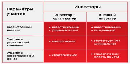 2. Мажоритарным акционером управляющей компании всегда является организатор проекта. При этом он имеет свой значительный пакет участия в инвестиционном фонде. Здесь наблюдается как полное удовлетворение управленческого интереса, так и соразмерное вкладу инвестиционное участие.