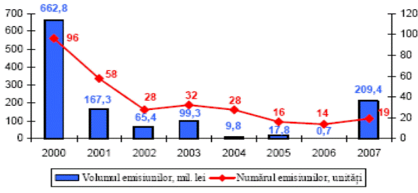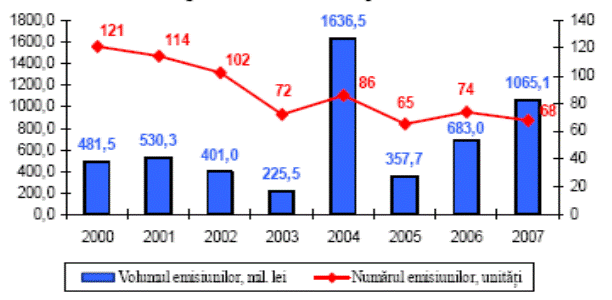 Количество и объем эмиссий ценных бумаг на фондовом рынке Республики Молдова за период 2000-2007гг. представлен в диаграмме 2.1.