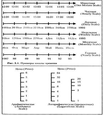 Пункт 3 табл. 1.1 указывает на то, какая шкала — арифметическая или логарифмическая (процентная) используется для построения того или иного типа графика. Арифметическая шкала наиболее проста и естественна и используется в большинстве случаев. Логарифмическая же шкала наглядно отражает не абсолютное изменение цены, а относительное и может быть полезна при составлении среднесрочного и долгосрочного графиков.