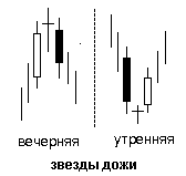 Усиливающие факторы для утренней и вечерней звезд: 1. Наличие разрывов между телами звезд и двумя соседними свечами. 2. Тело третьей свечи перекрывает значительную часть первой свечи. 3. Небольшой объем торговли во время первой торговой сессии и большой объем во время третьей сессии.