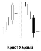 В модели «Крест Харами» на второй день (период) появляется дожи, а не свеча с маленьким телом. Крест Харами относится к наиболее значимым сигналам разворота, вследствие того, что содержит всесильного дожи. Крест Харами называют «моделью, приводящей в ужас». Кресты Харами могут образовываться и в основании, но они более эффективны на вершине.