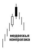 Бычья контратака похожа на модель «в основании», но белая бычья контратакующая свеча открывается значительно ниже (она значительно длиннее), поэтому «контратака» - модель разворота, а «в основании» – модель продолжения тенденции. Главное условие заключается в том, что цена открытия второй торговой сессии значительно ниже (бычья контратака) или выше (медвежья контратака) предыдущей свечи.