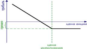 ·подписка (продажа) опциона колл (Short Call) - Одна из самых простых стратегий. Однако ее применение требует большой осторожности, так как в этом случае прибыль ограничена, а убыток ничем не ограничен. Часто применяется в сложных стратегиях с использованием страхующих составляющих, например, при продаже волатильности дополнительно открывается длинная позиция по базовому активу. Используется, если ожидается, что цена базового актива и его волатильность понизятся. (рис.3)