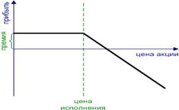 ·подписка (продажа) опциона пут (Short Put) - Одна из самых простых стратегий. Однако ее применение требует большой осторожности, так как в этом случае прибыль ограничена, а убыток ничем не ограничен. Часто применяется в сложных стратегиях с использованием страхующих составляющих, например, при продаже волатильности дополнительно открывается короткая позиция по базовому активу. Используется, если ожидается, что цена базового актива повысится, а его волатильность понизится. (рис. 4)