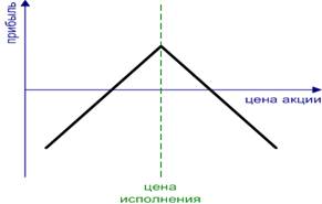 1. Стрэддл (стеллаж) (рис.4,5) - покупка опционов колл и пут с одинаковыми датами истечения и ценой исполнения. Данная стратегия – стратегия торговли волатильностью (волатильность – это показатель колебания доходности базисного актива до даты исполнения опциона). Здесь не важно, в какую сторону изменится цена базисного актива, важно, чтобы в принципе она изменялась, либо изменялись представления инвесторов о ней, или при стабильном рынке происходили некоторые колебания. На этих колебаниях и зарабатывает инвестор;