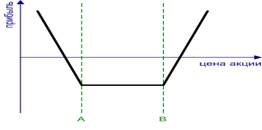 Продажа стрэнгла. Short Strangle. Данная стратегия заключается в продаже опционов колл и пут с одним сроком истечения контрактов, но разными ценами исполнения. Цена исполнения колла(В) должна быть больше, чем пута(А). Используется, если ожидается, что цена базового актива не изменится, волатильность понизится. (рис.7)