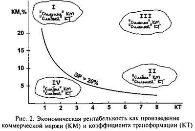 Идеальная позиция тяготеет к зоне III, но на практике соединить высокую КМ с высоким КТ бывает, как правило, очень трудно, так как при наращивании оборота КТ увеличивается, а КМ снижается, если только, как было отмечено выше, чистая прибыль не возрастает быстрее оборота. У большинства предприятий показатели располагаются между зонами I и II. При этом любое снижение к зоне IV опасно, так как грозит падением экономической рентабельности. В какой зоне оказывается, по Вашим расчетам, Ваша фирма?