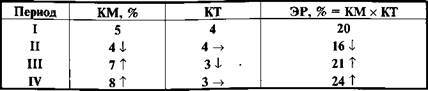 На КМ влияют такие факторы, как ценовая политика, объем и структура затрат и т. п. КТ складывается под воздействием отраслевых условий деятельности, а также экономической стратегии самого предприятия. Примирить высокую КМ с высоким КТ очень трудно, ибо ОБОРОТ присутствует в числителе одного сомножителя и в знаменателе другого. Поэтому при наращивании оборота удается увеличить экономическую рентабельность только тогда, когда под возросший оборот подставляют нераздутые активы, и чистая прибыль начинает расти быстрее оборота. В анализе факторов изменения рентабельности главное — решить вопрос, какой из показателей: КМ или КТ изменяется сильнее и быстрее, оказывая тем самым более мощное воздействие на общий уровень экономической рентабельности активов. Обратимся к условному примеру (см. рис. 2).