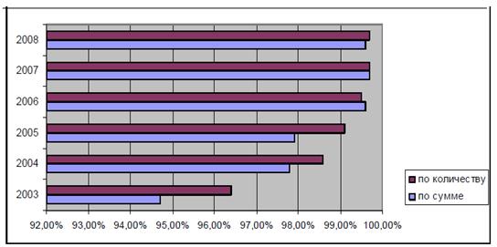Платежи с использованием электронных технологий составляют основную часть в платежах, проводимых через платежную систему Банка России. В 2008 году их доля достигла 99,7% от общего количества и 99,6% от общего объема платежей, проведенных через платежную систему Банка России.